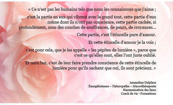 C'est de manière plus intense, plus profonde et plus large, un peu ce que je fais avec les énergies que je canalise directement à la source, et aussi avec les aides que je reçois de l'invisible, je viens vous rééquilibrer, vous apporter l'énergie nécessaire au processus de guérison. (Je ne peux pas dire que je guéris, je me ferais taper sur les doigts par la bienpensante, mais pourtant, j'en ai déjà vu des guérisons. C'est ainsi, et je refuse désormais de le nier, de me mettre sous silence ! Mais si vous voulez en savoir plus, lisez la liste de témoignages.)